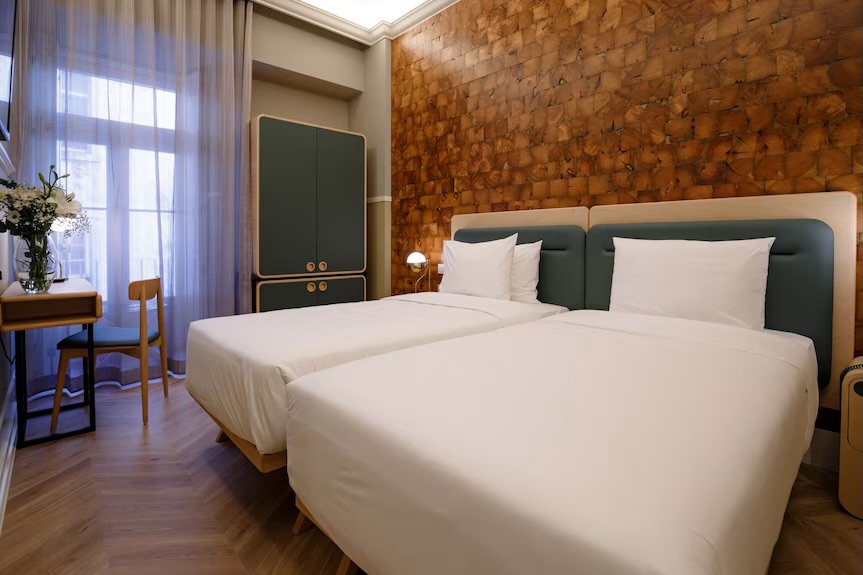 客室:モダンで落ち着いたデザイン。無料Wi-Fi、ミニバー、広めのデスク完備で、観光後もゆったり過ごせる。自然光が入り明るい雰囲気。